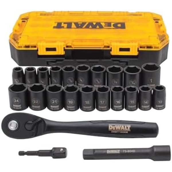 DEWALT Impact Socket Set with Ratchet, Metric/SAE, 1/2″ Drive, 23-Piece Set