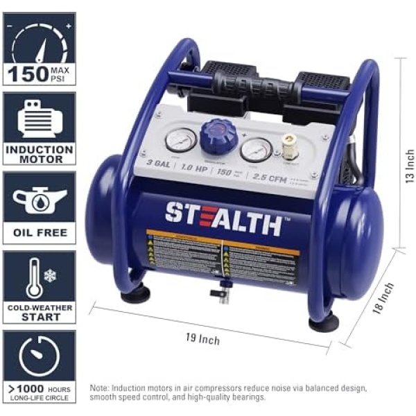 STEALTH Air Compressor 3 Gallon, Quiet Air Compressor, Oil-Free Air Tool