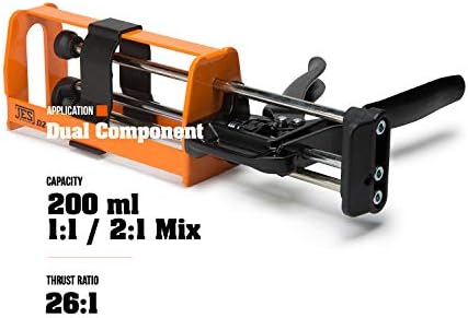 Professional dual component cartridge gun with 26:1 high thrust ratio, perfect for applying 2-part materials such as epoxy and injection foam, and compatible with 200 ml dual cartridges in 1:1 and 2:1 configurations