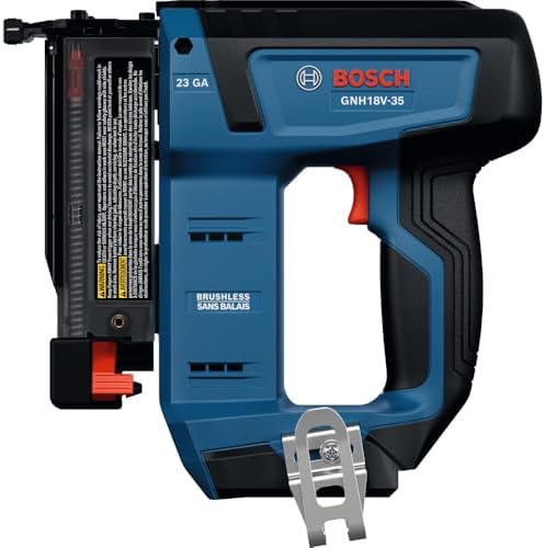What’s Included (Bare Tool): Package includes the Bosch GNH18V-35 18V Brushless 23-gauge Pin Nailer and two no-marring contact tips. 18V battery and charger are sold separately.