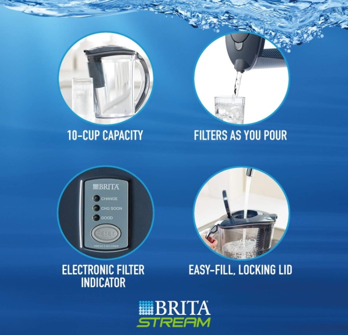 Brita Stream Rapids Water Filter Pitcher, Carbon Gray, Large 10 Cup, 1 Count