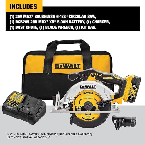 Included components: (1) DCS565 20V MAX* 6-1/2 in. Brushless Cordless Circular Saw; (1) DWA161218 Saw Blade; (1) Blade Change Wrench; (1) Optional Dust Chute; (1) Charger; (1) 20V MAX* Lithium Ion 5.0Ah Battery (DCB205); (1) Kit Bag