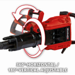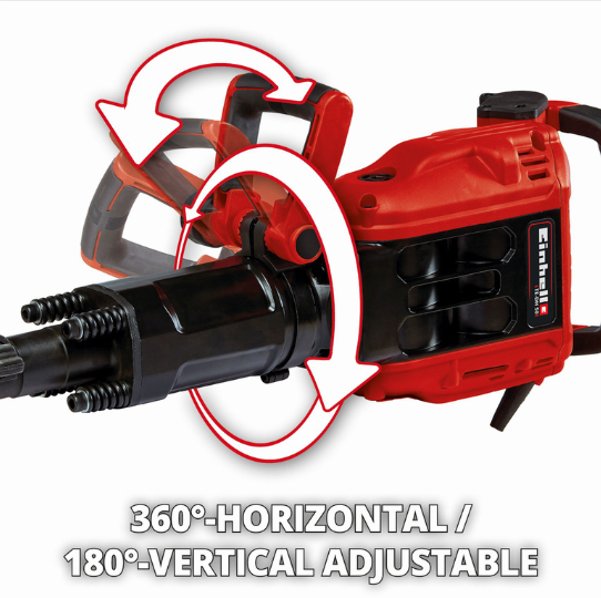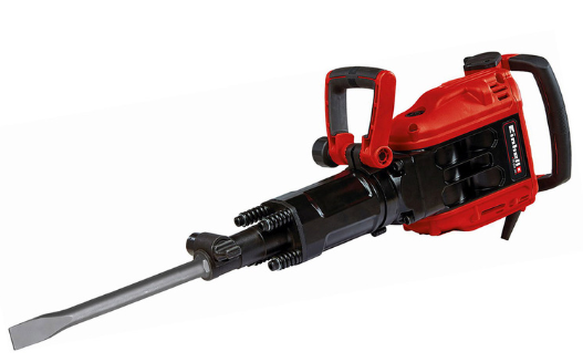 The Einhell TE-DH 50 demolition hammer is an ideal tool for heavy demolition work. With an impact rate of 1800 strikes per minute and 50 joules of single impact power delivered by the powerful 1700W motor, the highest demolition performance is guaranteed, all with a vibration cushioned main handle for low vibration operations. The SDS Hex tool chuck (33mm) allows for fast and problem free tool changes. The additional handle on the Einhell TE-DH 50 is designed to allow adjustment through 180° in the vertical direction and 360° horizontally, so the demolition hammer can be adapted flexibly to any working position. The robust 4m rubber cable provides the greatest possible mobility. Carbon brushes which switch off automatically also prevent malfunctions and afford additional protection for the TE-DH 50. Robust and durable in construction, the demolition hammer is designed for demanding, continuous operation. The demolition hammer is ready for immediate action thanks to the supplied pointed chisel and flat chisel, while the soft start function guarantees safe operation. A practical machinery towel is also included to enable the tool to be cleaned easily. The product is supplied in a practical transportation and storage case.