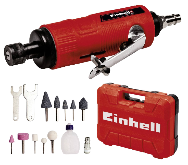 With the Einhell compressed air bar grinder TC-PP 220, the ambitious DIY enthusiast has a powerful tool at hand, whether in the home, workshop or garage. With a speed of up to 22,000 min^-1 it supports precisely and powerfully when grinding, polishing, engraving or deburring. The rod grinder from Einhell delivers best performance from an inner diameter of 9 mm. The rubberized grip allows comfortable and safe working. The compressed air bar grinder is optimized and suitable for one-handed use. The safety release lever prevents unintentional starting. The 10 grinding pins available in the accessories offer numerous application possibilities. The equipment also includes 1 oil bottle, 1 plug nipple and 2 clamping keys. Supplied in a practical transport and storage case.