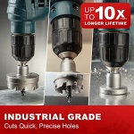Carbide teeth cut over 500 holes through stainless steel. Up to 10x longer cutting life vs standard bi-metal hole saws