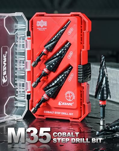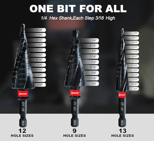 【3 Pcs Step Drill Bit Set】 The step drill bits are neatly organized in a compact case for easy transportation and storage. The spiral flutes and stepped design of the drill bits allow for seamless and efficient drilling through various thicknesses.