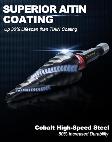 【AlTiN Coating】Step bits coated with aluminum titanium nitride, rated at 89HRC for exceptional hardness and thermal properties. This coating offers superior resistance to heat, wear, and corrosion, with high adhesion and low friction