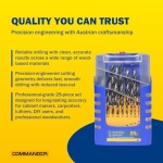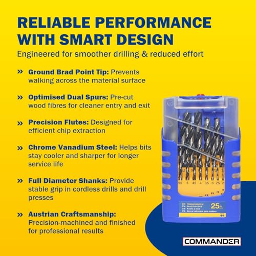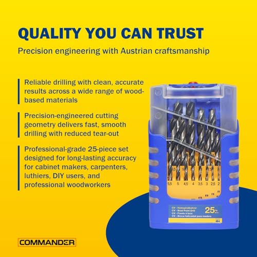 Fisch Brad Point Drill Bit Set, 25-Piece Chrome Vanadium Wood Drill Bits