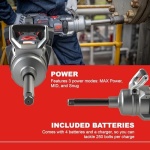 POWERFUL TOOL: This cordless power tool kit includes the W9691-K4E model with a brushless motor, a 6-inch extended anvil, 4 batteries, and a charger. The IQV Power Control System provides 3 modes: MAX Power, MID, and Snug.