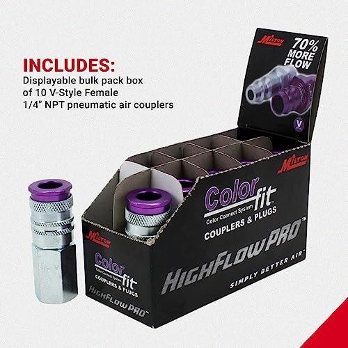 Includes: Displayable bulk pack box of ten V-Style Female 1/4″ NPT pneumatic air couplers