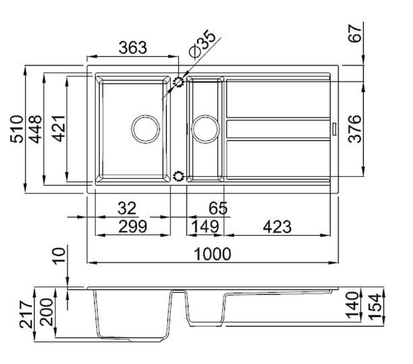 • Half bowl size of 421(L) x 149(W) x 140(D)mm