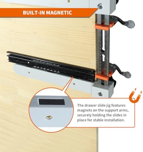 【Magnetic Support Arm for Stability】Simplify your work with the magnetic support arm, designed to hold the drawer slides firmly in place during installation. Though the plastic arms are just 12” long, the magnets are strong enough to hold a 24” slide steady.