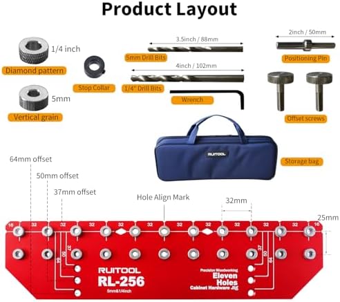 【Comprehensive Drill Bit Kit for Versatile Use】Equipped with 1/4-inch and 5mm drill bits and matching bushings for easy identification. The knurled bushing is for 1/4-inch, while the striped bushing is for 5mm. This all-in-one shelf pin drilling jig ensures smooth, precise drilling, perfect for custom furniture and home renovation projects.