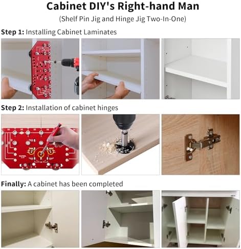 2-in-1: This tool is a combination of shelf pin jig and hinge jig functions. One tool can help you finish the whole cabinet DIY.
