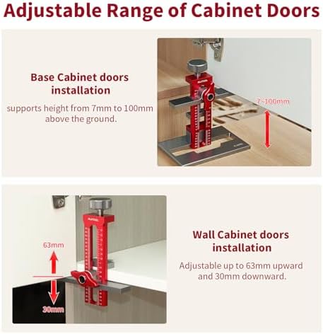 Easy Operation: The RUITOOL cabinet door installation positioner acts like your “third hand,” helping you align cabinet doors quickly and accurately. Offers 63 mm upward and 30 mm downward adjustment, with non-slip rubber pads to prevent slipping.