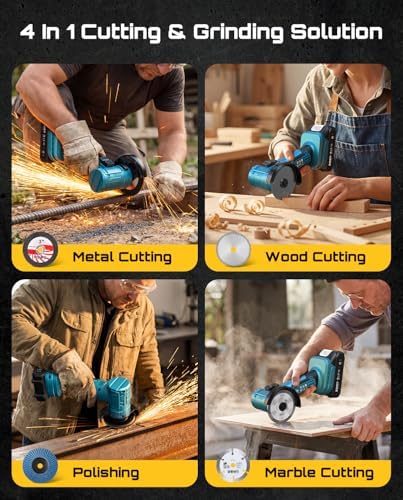 All-in-One Grinding Kit: Cordless Grinder tool package includes 4 cutting blades, 1 grinding wheel blade, 1 saw wood blade, and 1 Stone Cutting blade to handle everything from concrete, and ceramic, to metal and wood surfaces, perfect for quick cutting and grinding tasks anywhere, anytime.