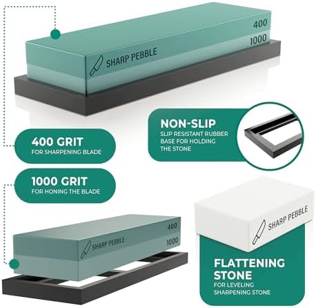 Superior Bundle: 3 Must-Have Sharpening kit bundled in one affordable set for you, whetstone (grit 400/1000) with Non-Slip Rubber Base + Flattening Stone + Knife Sharpening stone Guide(Ebook) are perfect for making very dull knives scary sharp