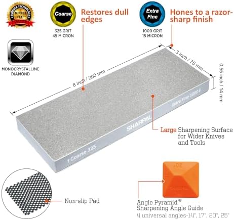 𝟑𝟐𝟓 𝐆𝐫𝐢𝐭 (𝟒𝟓 𝐦𝐢𝐜𝐫𝐨𝐧) / 𝟏𝟎𝟎𝟎 𝐆𝐫𝐢𝐭 (𝟏𝟓 𝐦𝐢𝐜𝐫𝐨𝐧) 𝐃𝐮𝐚𝐥-𝐒𝐢𝐝𝐞𝐝: Coarse 325 Grit (45 micron) restores dull edges; extra-fine 1000 Grit (15 micron) hones to a razor-sharp finish—offering efficient sharpening and honing in one stone.