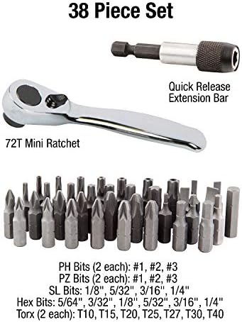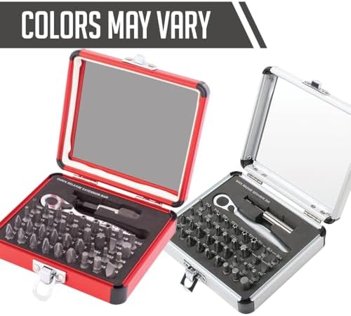 Includes: aluminum case, quick release extension bar, ratchet handle, and 36 bits