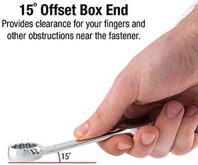 BOX END OFFSET BY 15 DEGREES: Provides clearance for your fingers and other obstructions near the fastener.