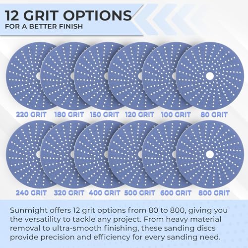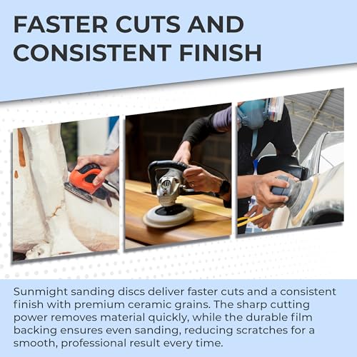 PREMIUM CERAMIC FILM FOR FAST CUTTING – Sunmight 6 inch sanding discs use high-quality ceramic grains for superior cutting power. The open-coat design prevents clogging, while hook & loop backing ensures a secure grip. Ideal for automotive, marine, aerospace, wood, and metal applications.