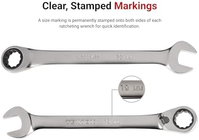 Clear, Stamped Markings – A size marking is permanently stamped onto both sides of each ratcheting wrench for quick identification