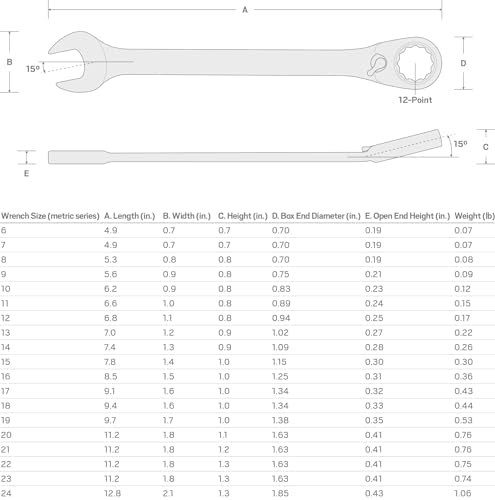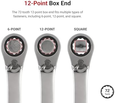 12-Point Box End – The 72-tooth ratcheting box end wrench requires a working swing ark of only 5-degrees and fits multiple types of fasteners, including 6-point, 12-point, and square