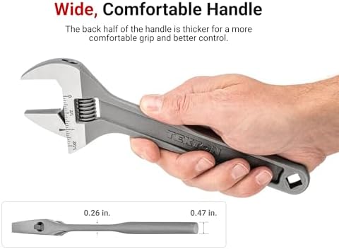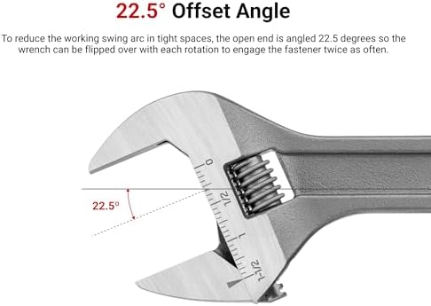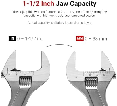1-1/2 Inch Jaw Capacity – The adjustable wrench features a 0 to 1-1/2 inch (0 to 38 mm) jaw capacity with high contrast laser-engraved scales
