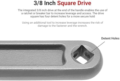 3/8 Inch Square Drive – The integrated 3/8 inch drive at the end of the handle enables the use of a ratchet or breaker bar to increase leverage and access