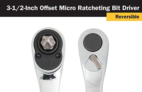 Set includes: (1) 1/4-Inch drive x 3-1/2-Inch offset ratchet, (1) 3-1/2-Inch ratcheting offset bit driver, (2) Phillips bits