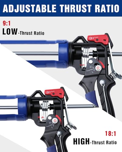 Switch at Will of High & Low Flow Rates: WORKPRO caulking gun allows for switching between high and low flow rates. Pull the trigger handle downwards, the high setting thrust ratio 18:1 for use with adhesive materials. Push the trigger handle upwards, the low setting of thrust ratio 9:1 for use with acrylic materials.
