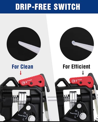 Drip Controllable: The hand caulk gun can switch from drip to less-drip for dispensing desired applications. Press down on the front of the red button, this process stops the caulk from flowing and allows for clean, smooth transitions and less mess to clean up. Press down towards the rear of the red button, this mode keeps constant pressure on the tube for providing smoother action and quicker working.